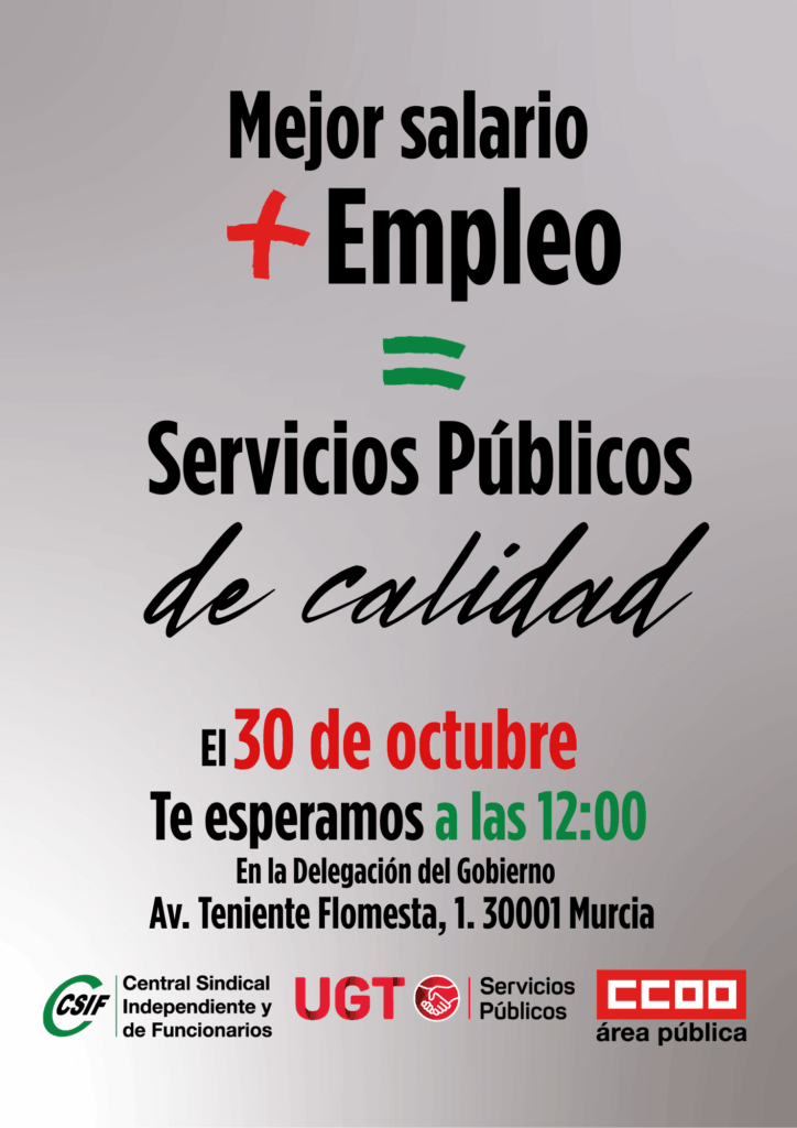 Los sindicatos UGT, CCOO y CSIF arrancan el próximo jueves, 30 de octubre, un calendario de movilizaciones en protesta por el bloqueo de la negociación colectiva de Función Pública, que mantiene congeladas las nóminas de este año e impide un nuevo acuerdo salarial. Ese comienzan las protestas en toda España, con una concentración frente al Ministerio de Función Pública en Madrid y, en el el caso de Región de Murcia, frente a la Delegación del Gobierno