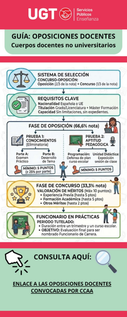En este boletín encontrarás toda la información sobre cómo son las oposiciones para el acceso a la función pública para los diferentes cuerpos docentes no universitarios, las especialidades correspondientes a las que se puede optar y las consideraciones para el desempeño en régimen de interinidad.