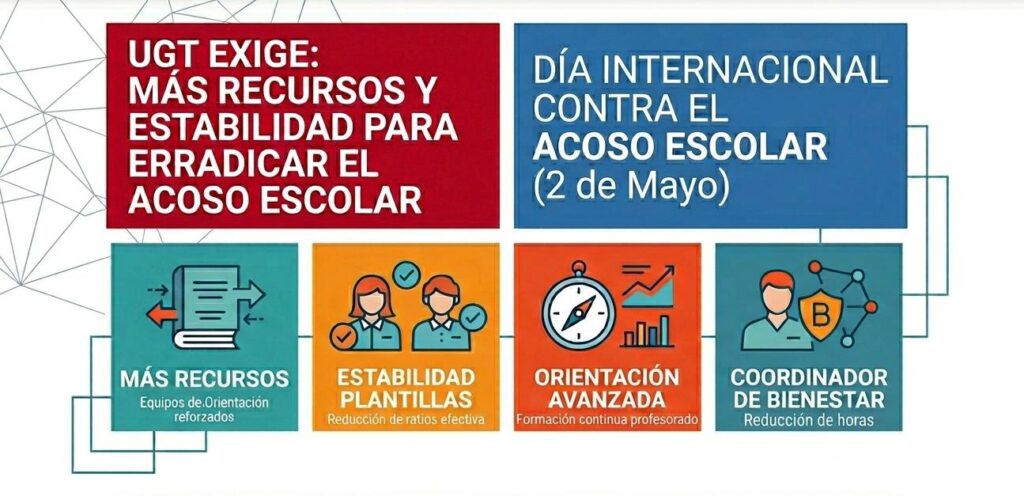 El Sector de Enseñanza de UGT Servicios Públicos manifiesta su firme compromiso con la erradicación de cualquier tipo de violencia en los centros educativos con motivo del Día Internacional contra el Acoso Escolar, que se celebra este 2 de mayo. Para el sindicato, la convivencia escolar no es solo un objetivo educativo, sino un derecho fundamental que las Administraciones educativas deben garantizar mediante inversión y recursos, y no solo con declaraciones de buenas intenciones.
